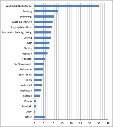 Here is the ranking of sports which were actually played/exercised by Japanese people these days. Survey was conducted by Japanese Government in 2012. Rank Sport Sport % 1 ウォーキング・軽い体操 Walking/Light Exercise 35.2 2 ボウリング Bow…