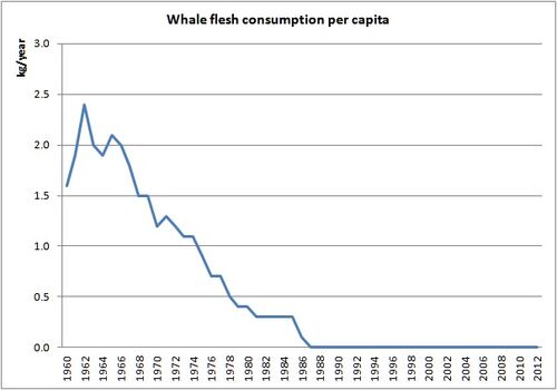 According to a government survey in 2012, whale flesh consumption per day per capita was 0.1 gram in Japan. Table : Whale flesh consumption by year per capita kg/year g/day 1960 1.6 4.5 1961 1.9 5.2 1962 2.4 6.7 1963 2.0 5.6 1964 1.9 5.1 1…