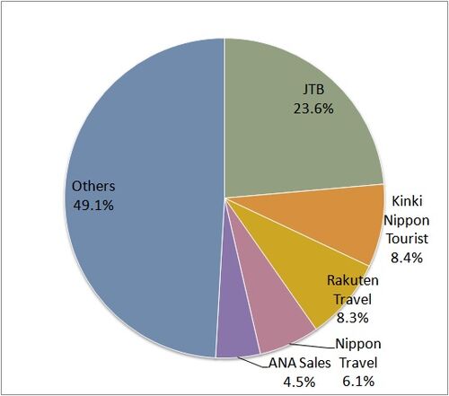 Nikkei press estimated 2013 market share of travel agencies, in terms of domestic trips in Japan. According to it, the total sales of 2013 were 4.132 trillion yen. JTB (formerly known as Japan Tourist Bureau) had the biggest share. JTB als…