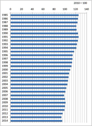 Ministry of Internal Affairs and Communications has checked the price of yogurt for 30 years. The following data show the trend of the price indexes of yogurt between 1985 and 2014, if the price in 2010 is taken as 100. The price is decrea…