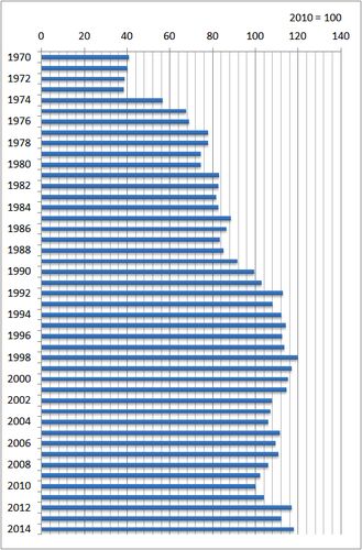 Japanese government monitors the price of strawberries every month. The following data show the changes in the price indexes of strawberries between 1970 and 2014, if the price in 2010 is taken as 100. Year Index (2010 = 100) Price of 1kg …