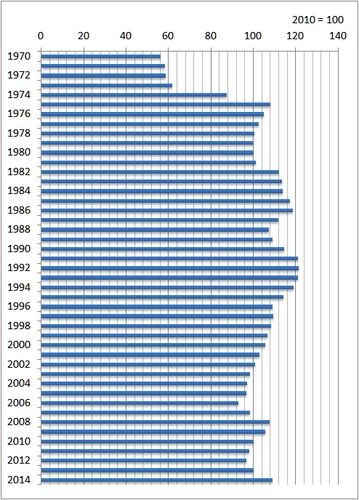 Japanese government monitors the price of mayonnaise every month. The following data show the changes in the price indexes of mayonnaise between 1970 and 2014, if the price in 2010 is taken as 100. Year Index (2010 = 100) Price of 450g may…