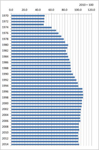 Ministry of Internal Affairs and Communications monitors the fire insurance fee monthly. The data below show the changes in the price indexes of fire insurance fee between 1970 and 2014, if the price in 2010 is taken as 100. Year Index (20…