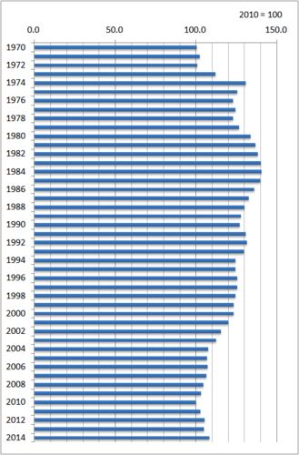 Ministry of Internal Affairs and Communications monitors the price of blanket monthly. The data below show the changes in the price indexes of blanket between 1970 and 2014, if the price in 2010 is taken as 100. Year Index (2010 = 100) Pri…