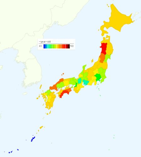 National Institute of Population and Social Security Research reports the average age by prefecture every year. The following shows the latest 2013 data. Okinawa has the youngest number, and Akita has the oldest. Figure: Average Age by Pre…