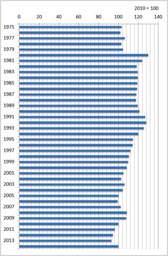 Ministry of Internal Affairs and Communications monitors the price of rolled toilet paper monthly. The data below show the changes in the price indexes of rolled toilet paper between 1975 and 2014, if the price in 2010 is taken as 100. Yea…