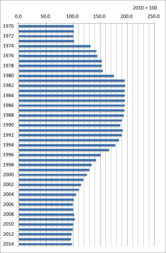 Ministry of Internal Affairs and Communications monitors the price of laundry detergent monthly. The data below show the changes in the price indexes of laundry detergent between 1970 and 2014, if the price in 2010 is taken as 100. Year In…