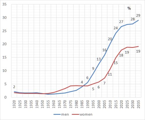 The following table shows the percent of men and women in Japan ages around 50 who never married, and the estimated percent of them in the future. Year men % women % 1920 2 2 1925 2 2 1930 2 1 1935 2 1 1940 2 1 1950 1 1 1955 1 1 1960 1 2 1…