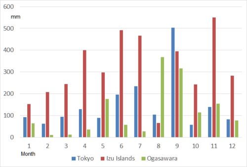 The following graph shows the average monthly precipitation in Tokyo, including Izu islans and Ogasawara islands. Table: Precipitation in Tokyo, Izu Islands (Hachijo), Ogasawara. Unit: mm Month 1 2 3 4 5 6 7 8 9 10 11 12 Tokyo 93 62 94 129…
