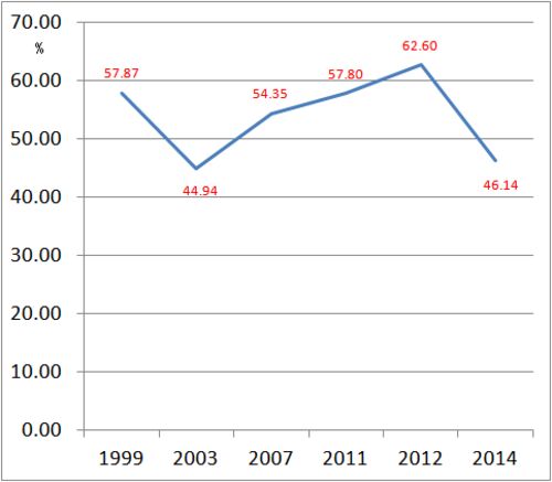 The data below shows the voter turnout in Tokyo Metropolitan governor elections. Year Voters Turnout rate (%) 1999 5,510,042 57.87 2003 4,442,195 44.94 2007 5,565,127 54.35 2011 6,072,604 57.80 2012 6,647,744 62.60 2014 4,930,251 46.14 Sou…