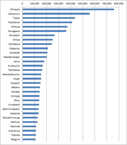 JR East, the biggest railway company in Japan, releases the number of their passengers (get-on passengers) a day by station every year. The data below show the ranking in the Greater Tokyo area. The number does not include other railway's …