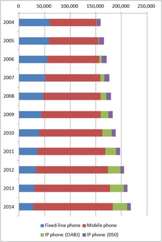 The data below show the changes in the telephone subscriberships in Japan between 2004 and 2014. Figure: Telephone subscriberships in Japan, 2004-2014 (unit: 1000 contracts) The number of fixed-line phone subscribers decreases. Meanwhile, …