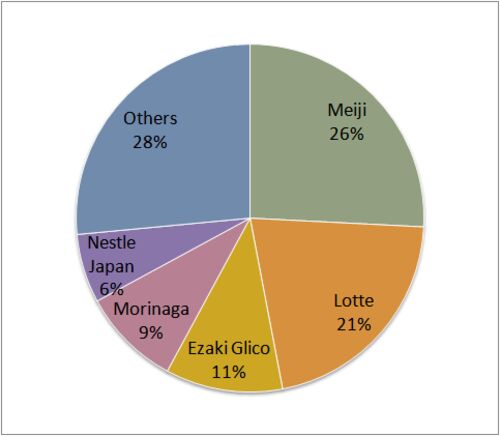 Nikkei press reported 2015 chocolate market share in Japan. According to it, the top supplier was Meiji (26%). Figure: 2015 Chocolate Market Share in Japan Manufacturer Market share (%) Meiji 25.8 Lotte 21.2 Ezaki Glico 10.9 Morinaga 9.2 N…