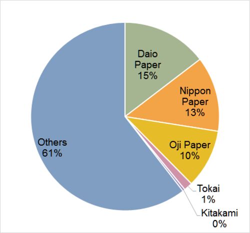 Nikkei press reported 2015 tissue and toilet paper market share in Japan. According to it, the top supplier was Daio Paper (15%). Figure: 2015 Tissue and Toilet Paper Market Share in Japan Manufacturer Market share (%) Daio Paper 14.6 Nipp…