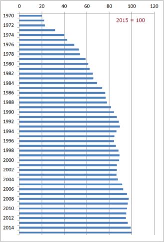 Ministry of Internal Affairs and Communications monitors the price of women's winter skirt monthly. The data below show the changes in the price indexes of women's winter skirt between 1970 and 2015, if the price in 2015 is taken as 100. Y…