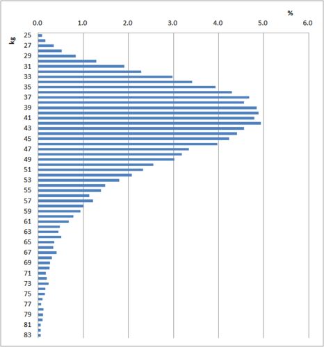 In every April, students are measured their heights and weights at school. The government collects those data and publishes them each year. Here are the 2015 data on the distribution of 12 year-old boys' weights. Figure: Distribution of 12…