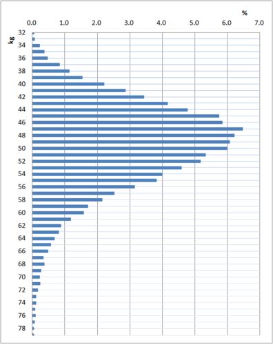 In every April, students are measured their heights and weights at school. The government collects those data and publishes them each year. Here are the 2015 data on the distribution of 14 year-old girls' weights. Figure: Distribution of 1…