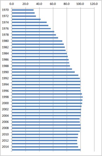 Ministry of Internal Affairs and Communications monitors the price of men's shoes monthly. The data below show the changes in the price indexes of men's shoes between 1970 and 2015, if the price in 2015 is taken as 100. Year Index (2015 = …