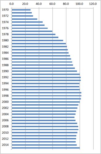 Ministry of Internal Affairs and Communications monitors the price of women's shoes monthly. The data below show the changes in the price indexes of women's shoes between 1970 and 2015, if the price in 2015 is taken as 100. Year Index (201…