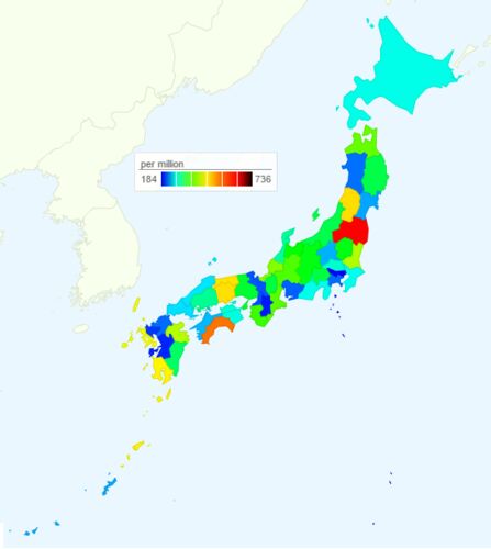 In Japan, 37222 persons died by acute myocardial infarction in 2015. The following data show the rate of deaths from acute myocardial infarction by prefecture (The number of deaths by acute myocardial infarction per million). Figure: Rate …