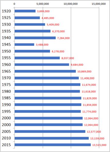 The following data show the changes in population of Tokyo Metropolitan, from 1920 to 2015. Year Population 1920 3,699,000 1925 4,485,000 1930 5,409,000 1935 6,370,000 1940 7,284,000 1945 3,488,000 1950 6,278,000 1955 8,037,000 1960 9,684,…