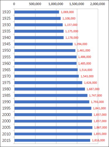 The following data show the changes in population of Mie prefecture, from 1920 to 2015. Year Population 1920 1,069,000 1925 1,108,000 1930 1,157,000 1935 1,175,000 1940 1,178,000 1945 1,394,000 1950 1,461,000 1955 1,486,000 1960 1,485,000 …