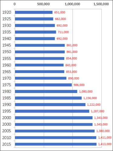 The following data show the changes in population of Shiga prefecture, from 1920 to 2015. Year Population 1920 651,000 1925 662,000 1930 692,000 1935 711,000 1940 692,000 1945 861,000 1950 861,000 1955 854,000 1960 843,000 1965 853,000 197…