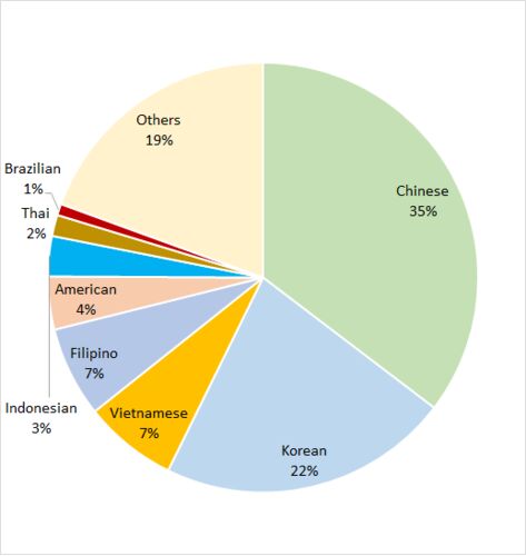 The following data show foreign resident populations by their nationality in Miyagi prefecture. It is the 2015 national census data. Total 13,989 foreign residents lived in there. Nationalty Population Chinese 4947 Korean 3066 Vietnamese 9…