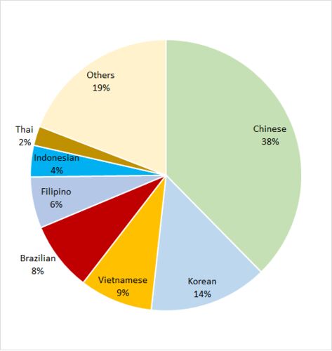 The following data show foreign resident populations by their nationality in Ishikawa prefecture. It is the 2015 national census data. Total 9308 foreign residents lived in there. Nationalty Population Chinese 3504 Korean 1313 Vietnamese 8…