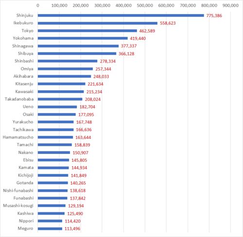JR East, the biggest railway company in Japan, releases the number of their passengers (get-on passengers) a day by station every year. The data below show the ranking in the Greater Tokyo area. The number does not include other railway's …
