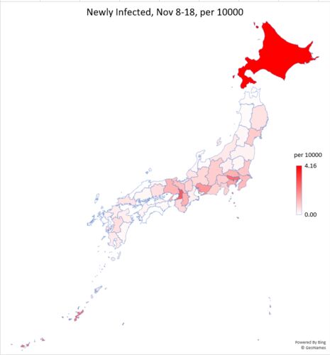 The following data show the number of coronavirus infected persons in Japan by prefecture, as of Nov 18. These are cumulative numbers. The situation of Hokkaido is getting worse. Table: Number of coronavirus infected persons in Japan by pr…