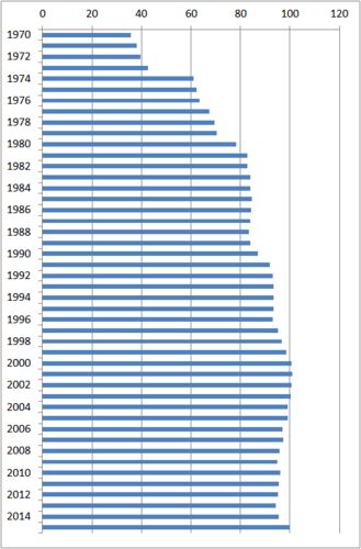 Ministry of Internal Affairs and Communications monitors the price of liquid type kitchen detergent monthly. The data below show the changes in the price indexes of kitchen detergent between 1970 and 2014, if the price in 2010 is taken as …