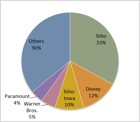 Nikkei Press estimated the market share of movie distributors in Japan in 2015. According to it, Toho has the biggest share (33%). The industry-wide total sales were 217 billion yen in 2015.