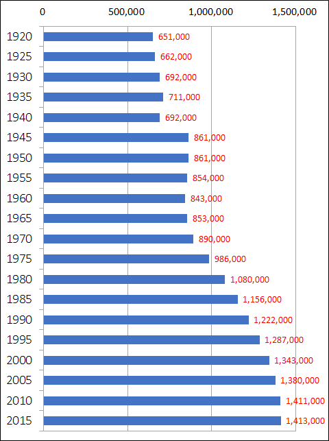 The following data show the changes in population of Shiga prefecture, from 1920 to 2015.